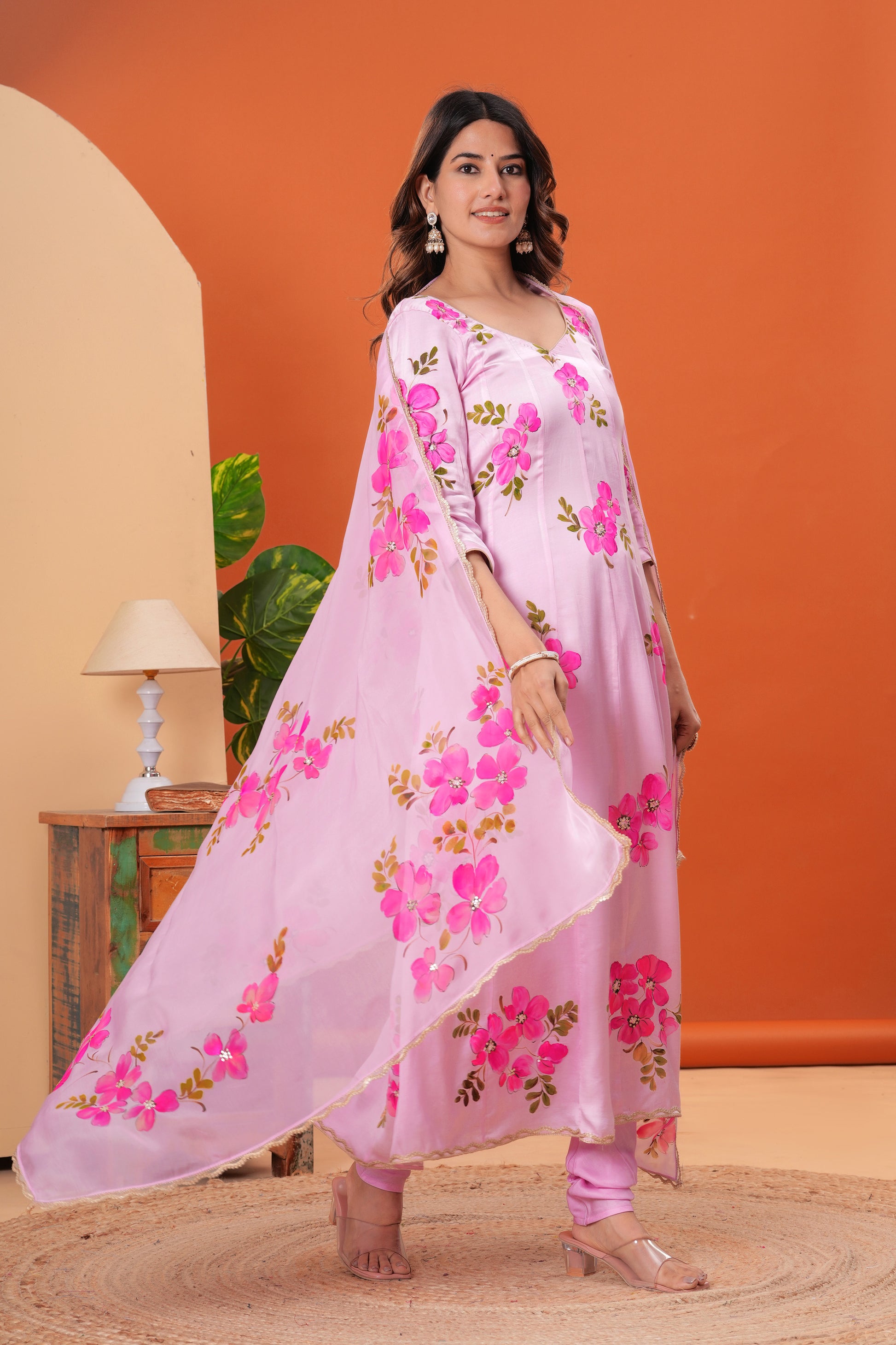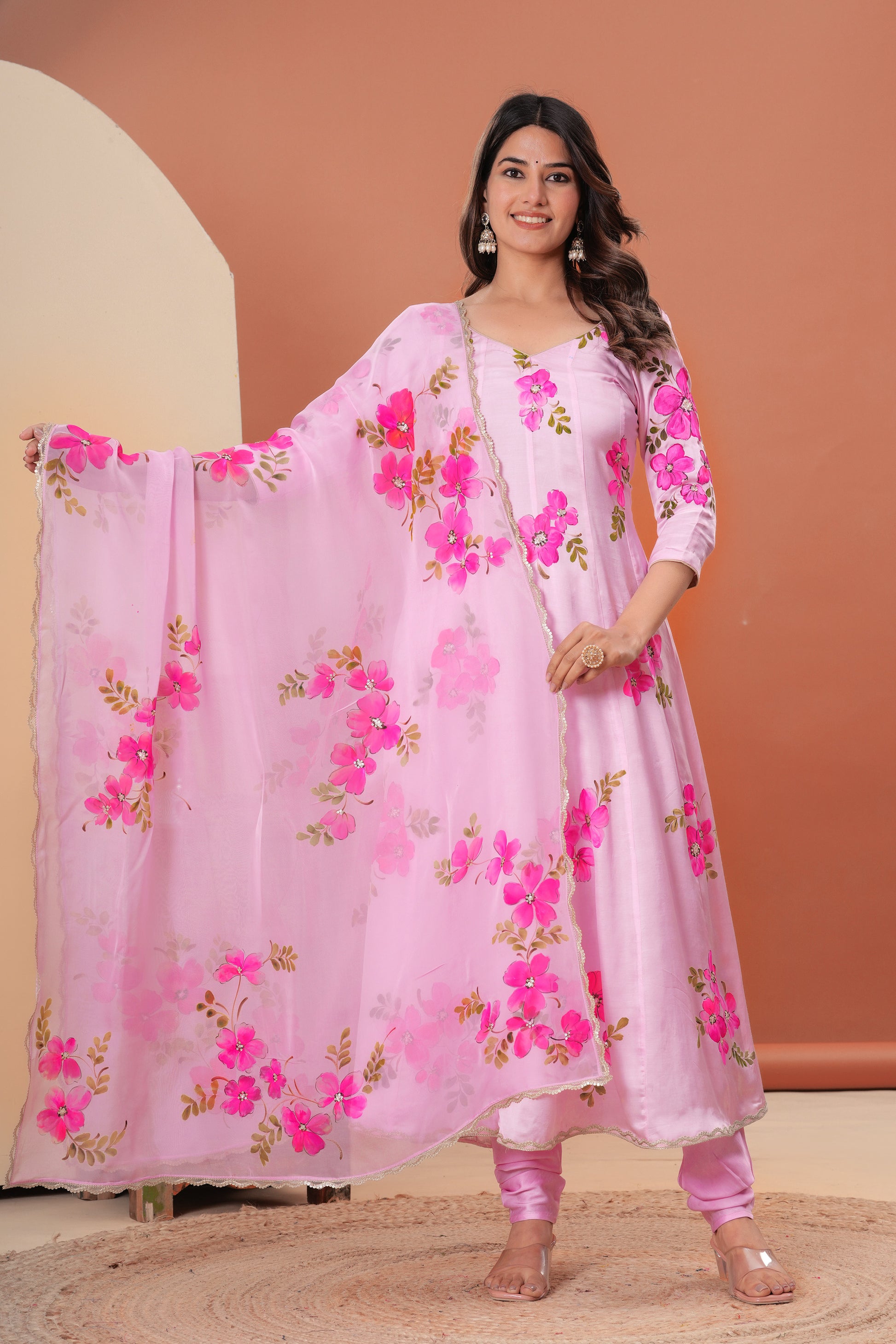 Elevate your ethnic wardrobe with this exquisite hand-painted pink Anarkali, designed for timeless elegance. The flowing silhouette is complemented by a delicately hand-painted organza dupatta, adorned with intricate floral motifs, shimmering sequins, and fine hand embroidery. Paired with a classic churidar, this ensemble offers grace, comfort, and sophistication. Perfect for weddings, festive celebrations, and special occasions, this Anarkali is a masterpiece of craftsmanship. Pair it with statement jewelry and heels for a regal look. Own this exclusive hand-painted creation and make every moment special!