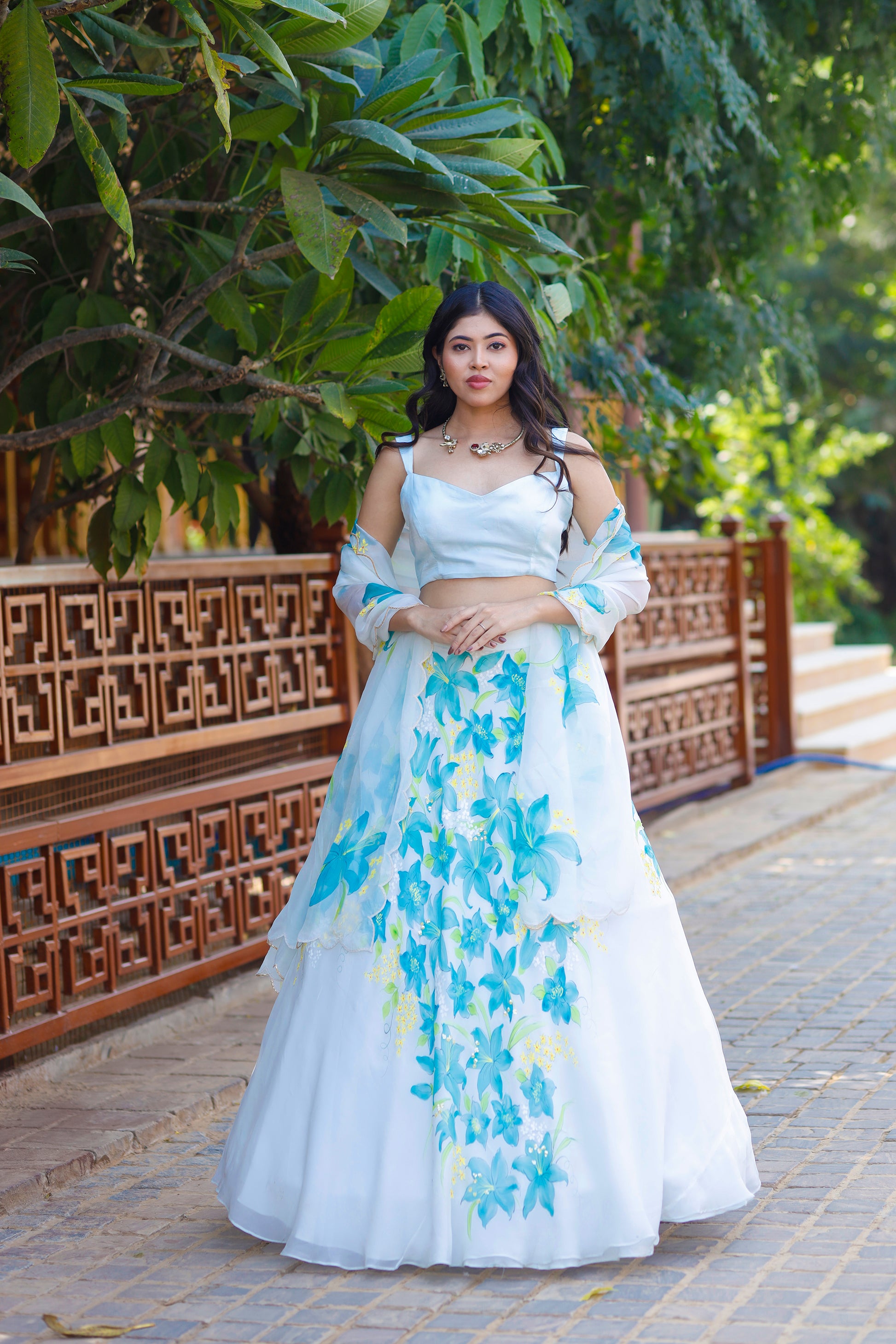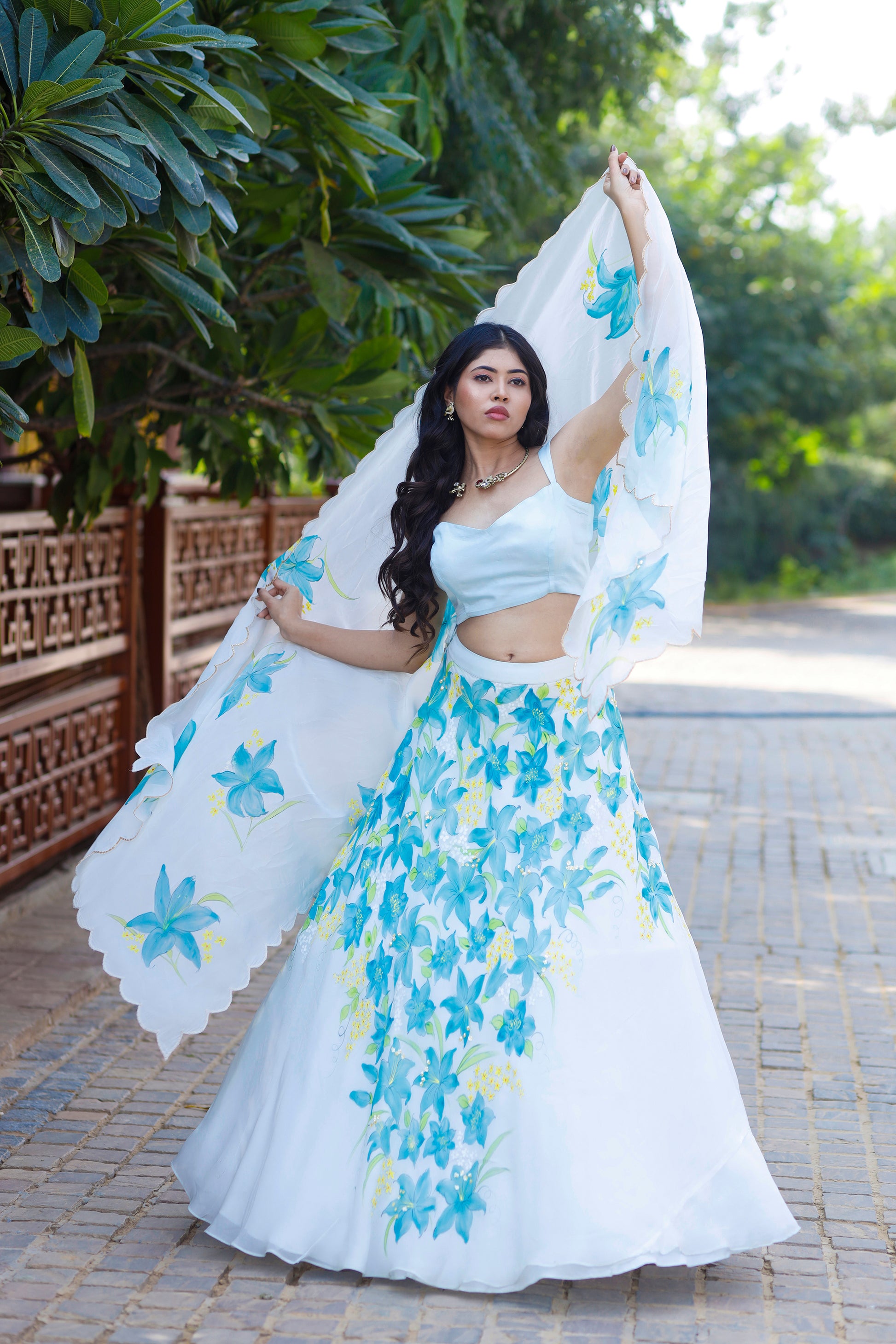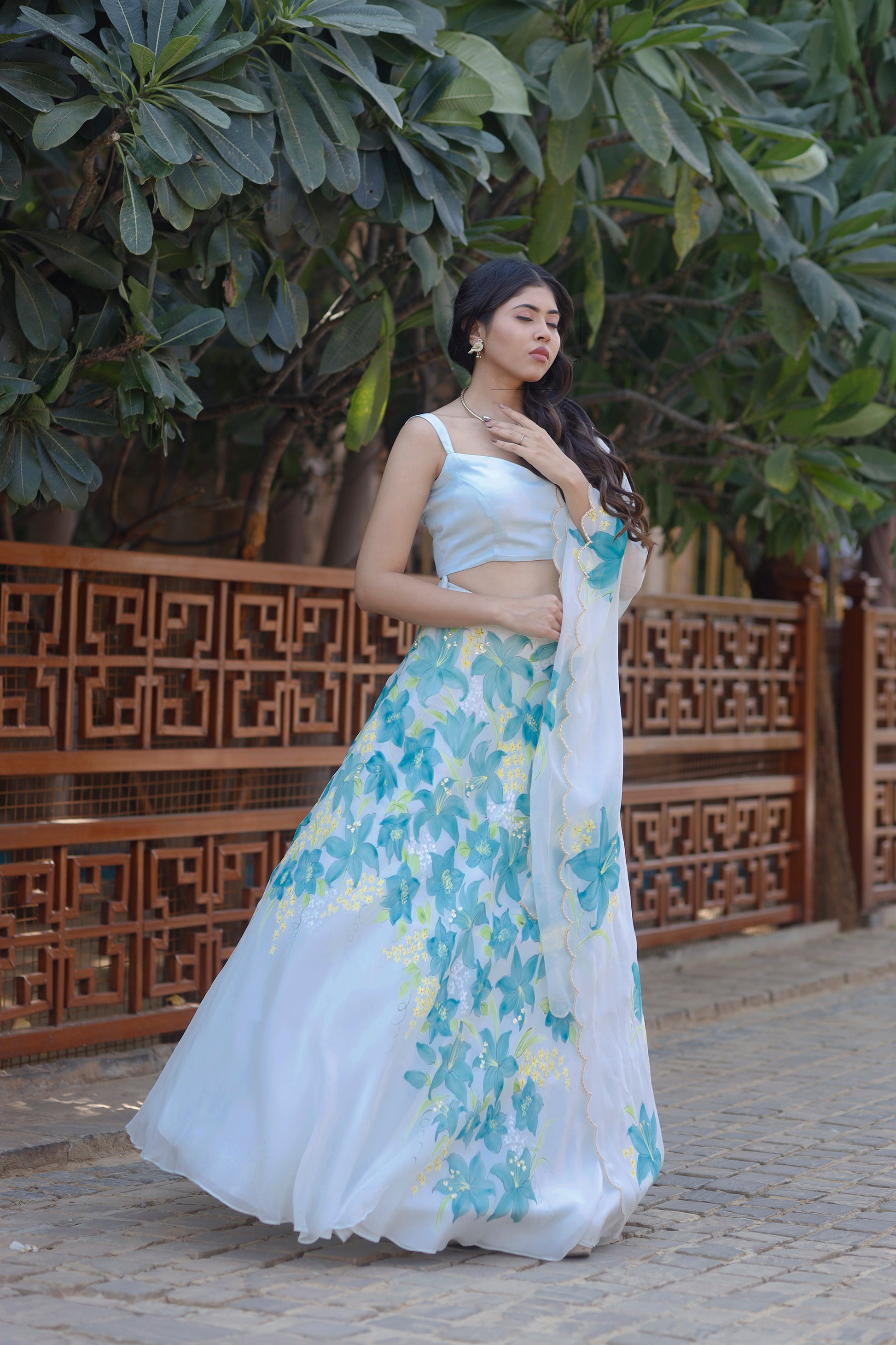 Hand-painted flowers on turquoise organza lehenga enhanced with sequin embroidery, paired with a beautiful trendy blouse in satin silk and paired with an organza dupatta adorned with gota scallop edging. This lehenga is a perfect outfit for an Engagement or sangeet party.