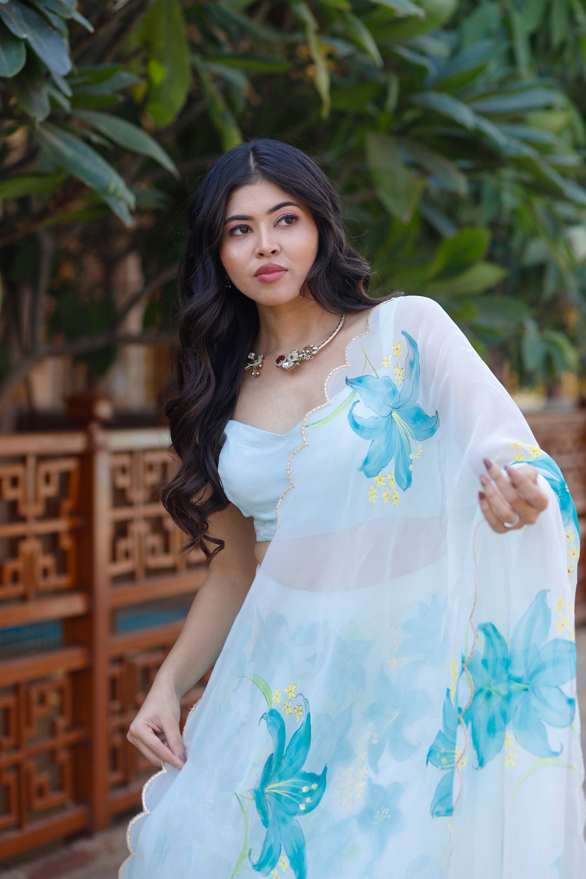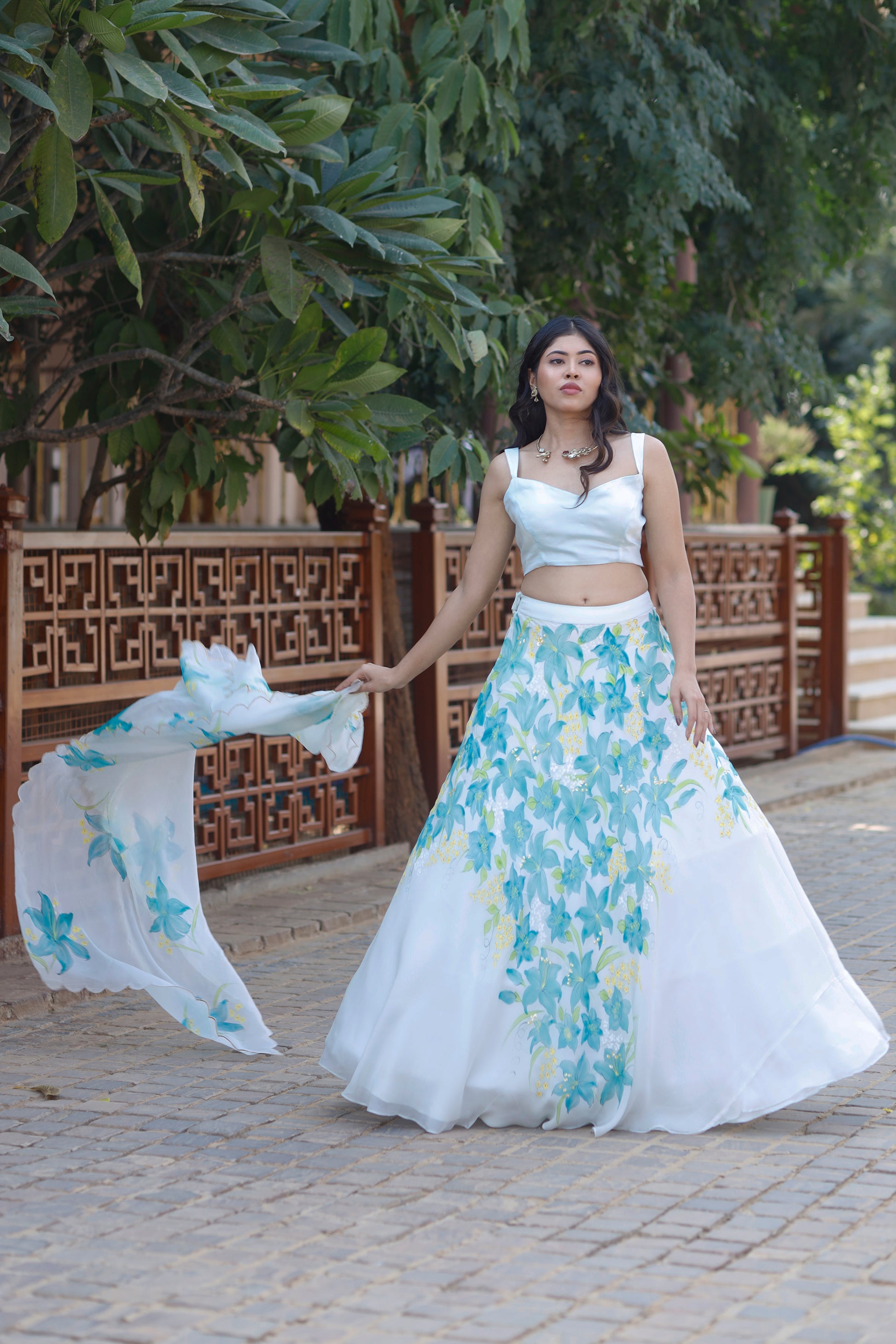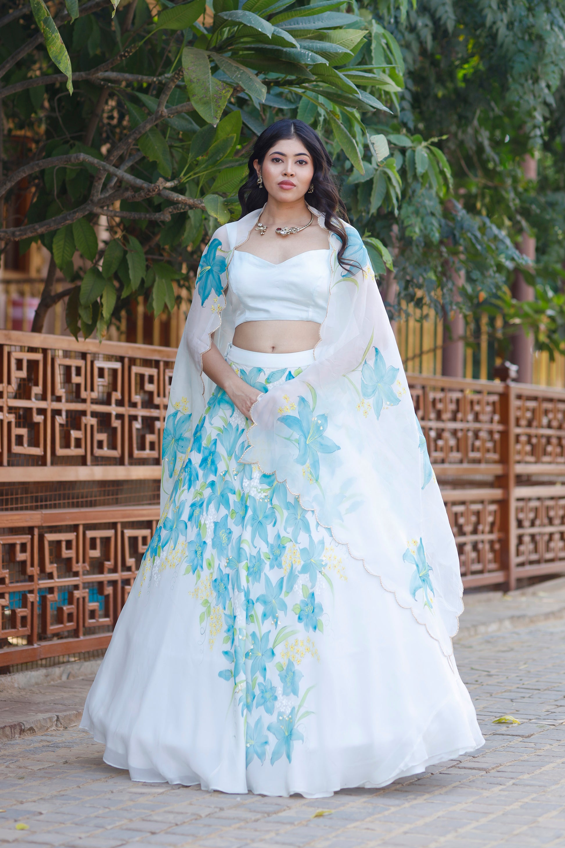 Hand-painted flowers on turquoise organza lehenga enhanced with sequin embroidery, paired with a beautiful trendy blouse in satin silk and paired with an organza dupatta adorned with gota scallop edging. This lehenga is a perfect outfit for an Engagement or sangeet party.