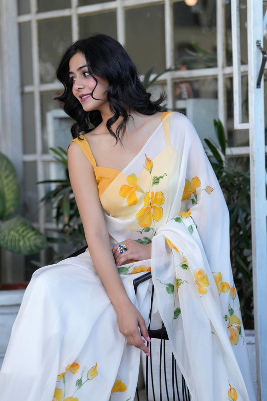 WHITE COLOR POPPY FIELD CHANDERI SAREE