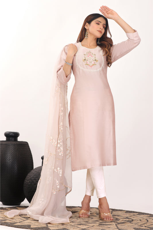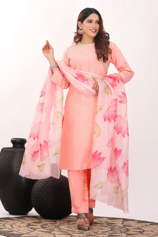 Crafted on Organza Dive into the ethereal world of hand painted organza suits. These translucent wonders embody sheer elegance, adorned with motifs that come to life with every movement. Light as air and graceful as a dance, our handpainted organza suits are the epitome of feminine grace.