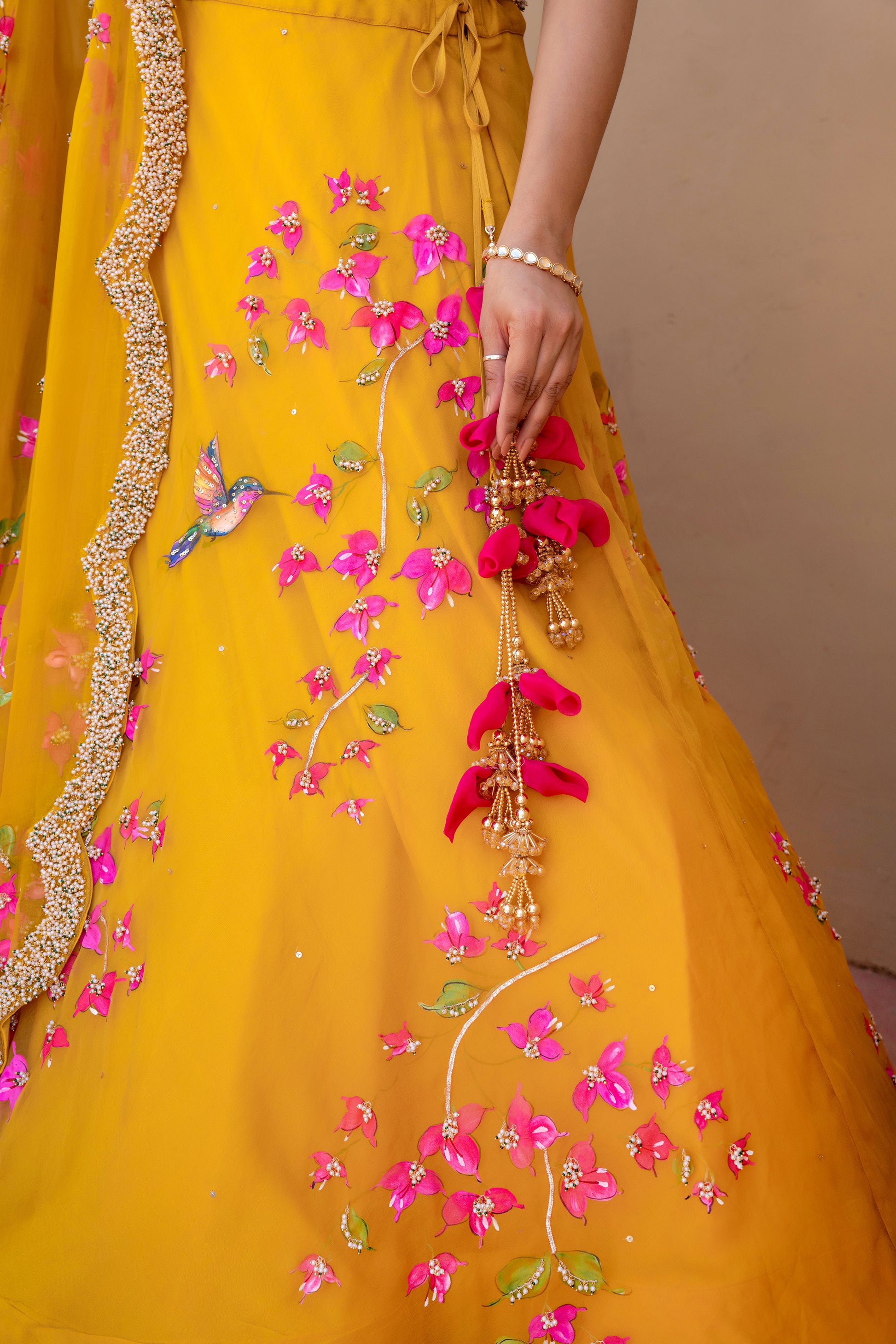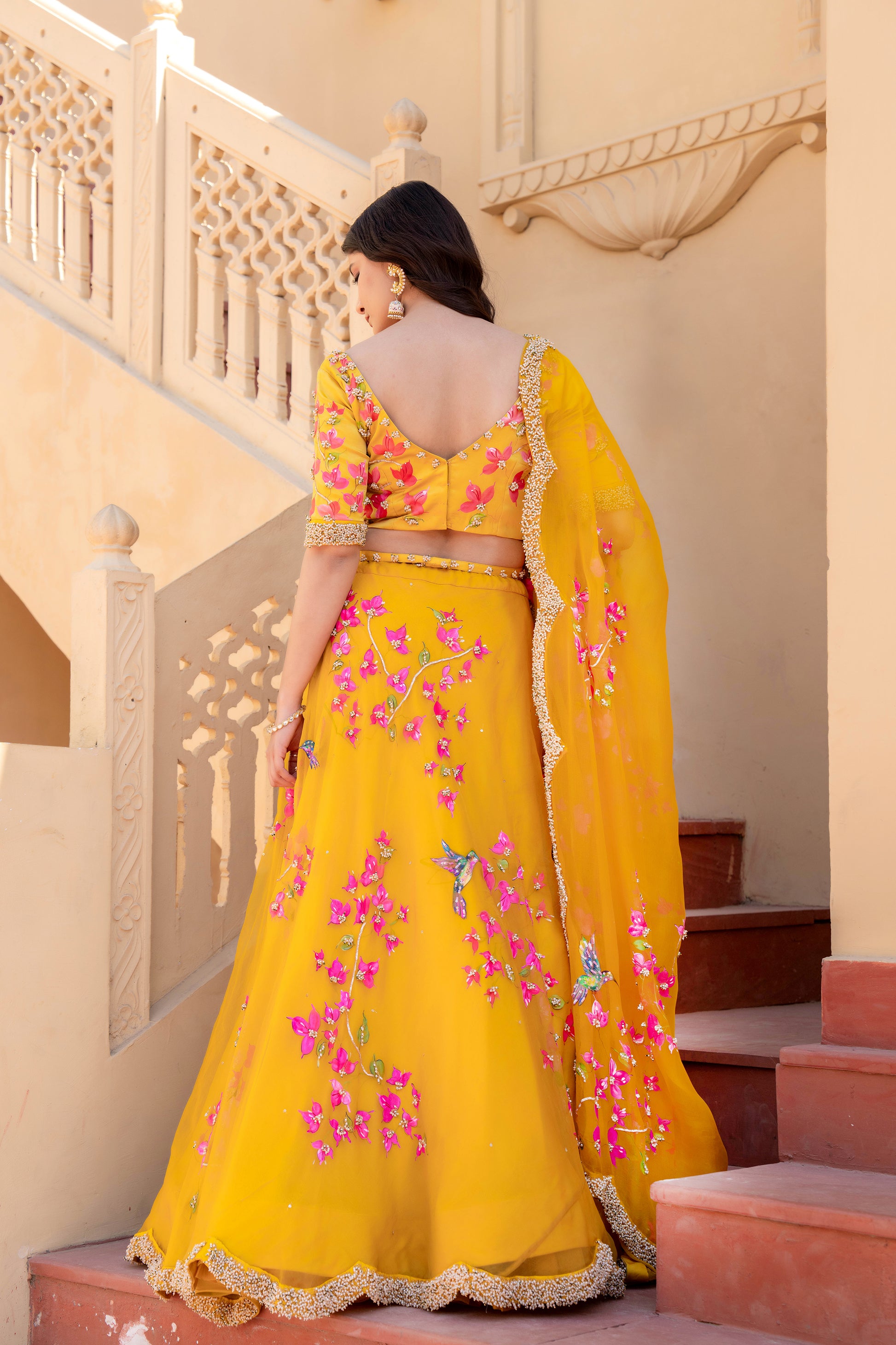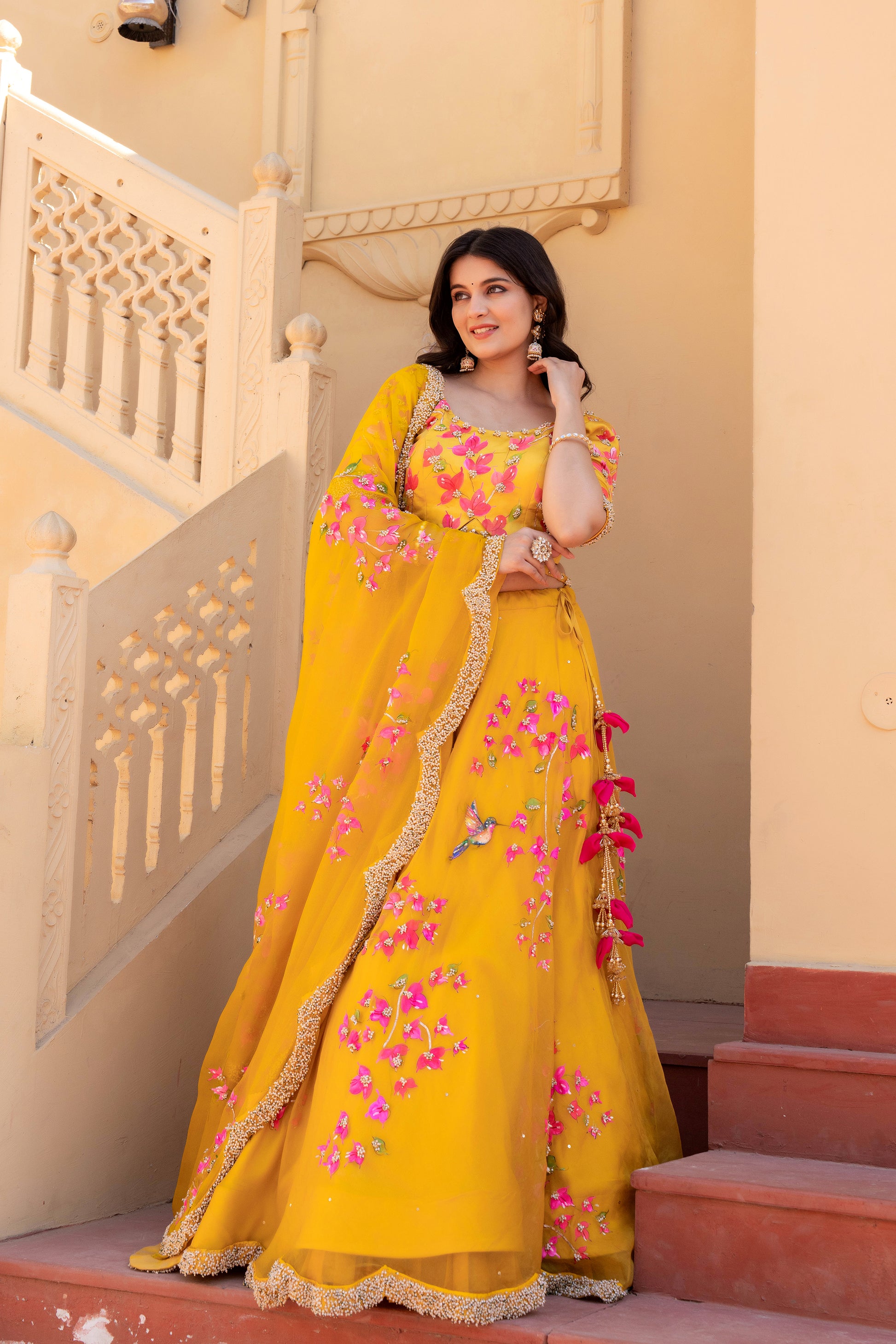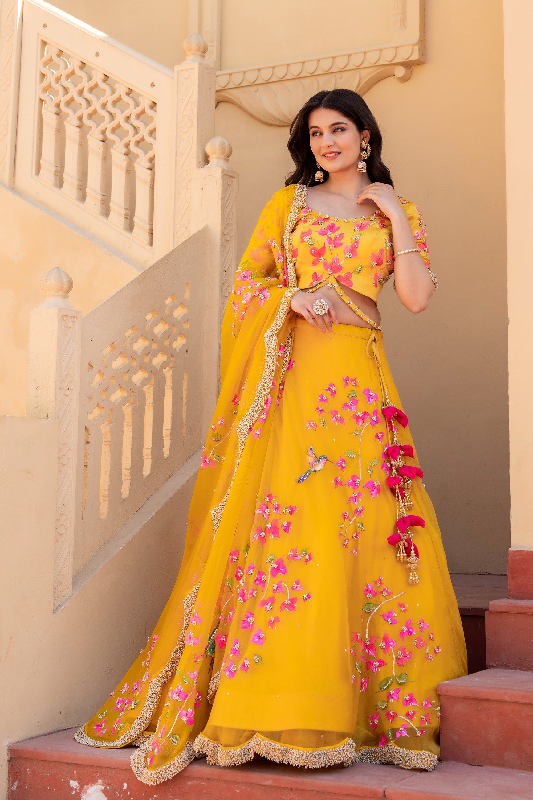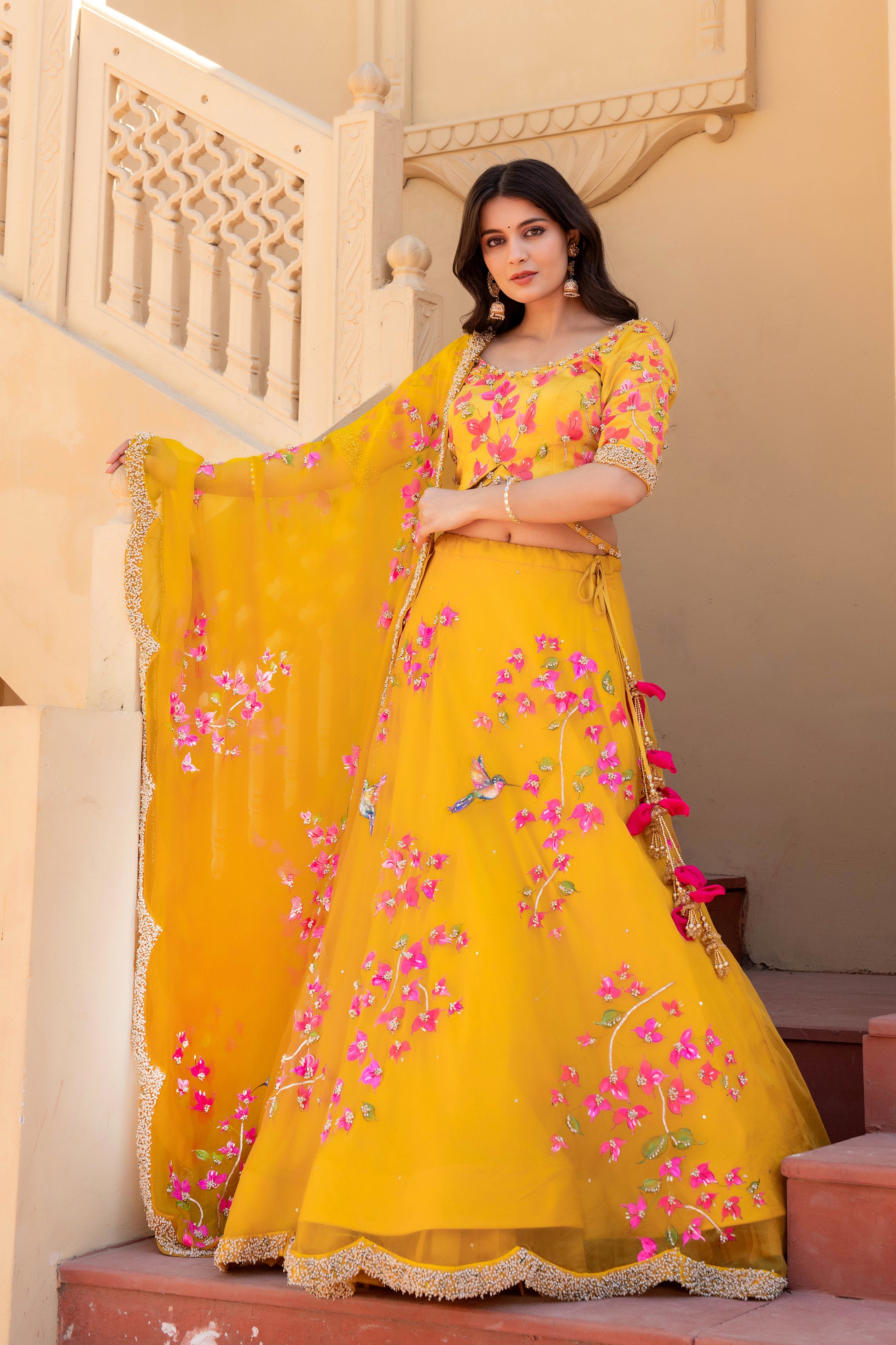 Celebrate timeless artistry with our Hand-Painted Bougainvillea Organza Lehenga, drenched in a rich deep mustard yellow hue. The lehenga features vivid, hand-painted bougainvillea floral motifs, delicately brushed by skilled artisans to reflect the essence of blooming elegance.