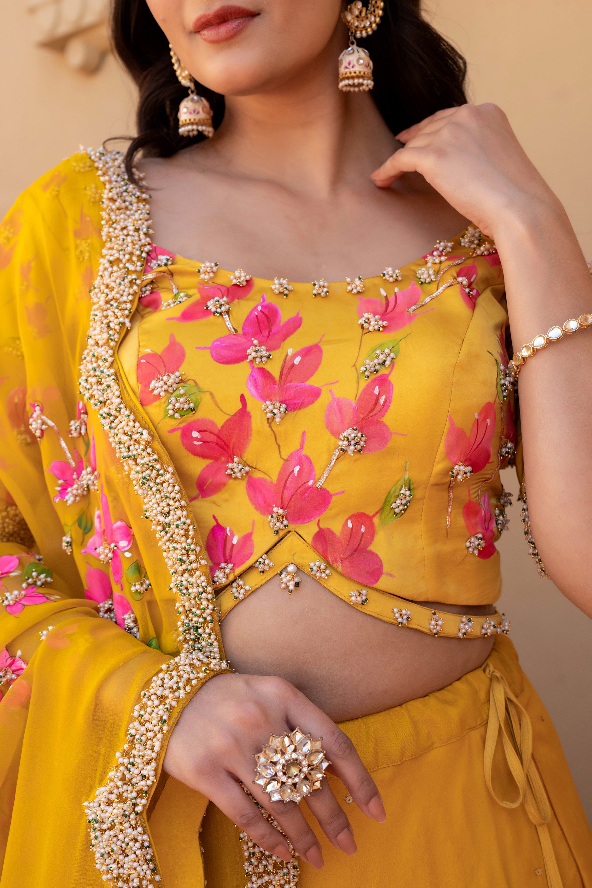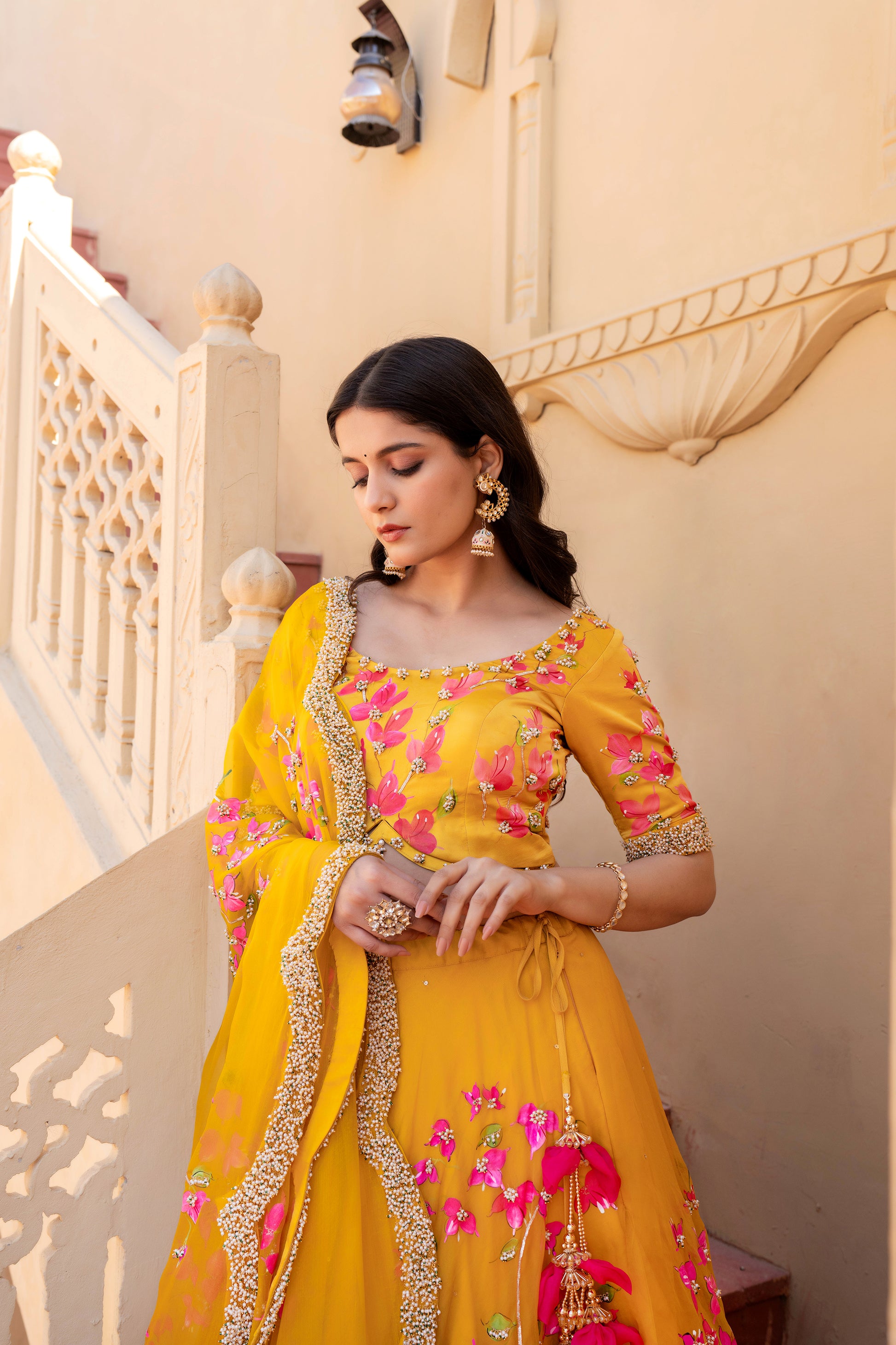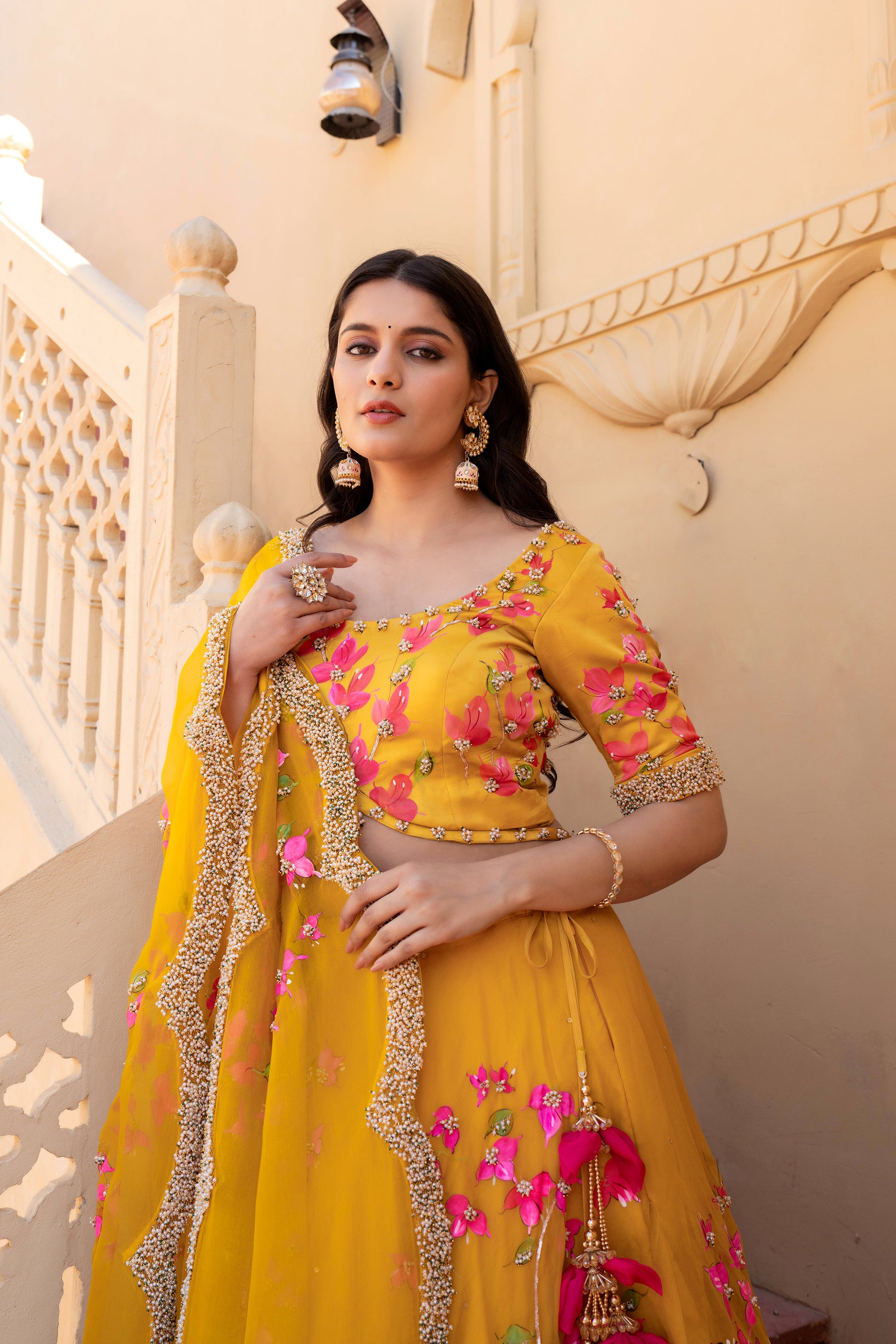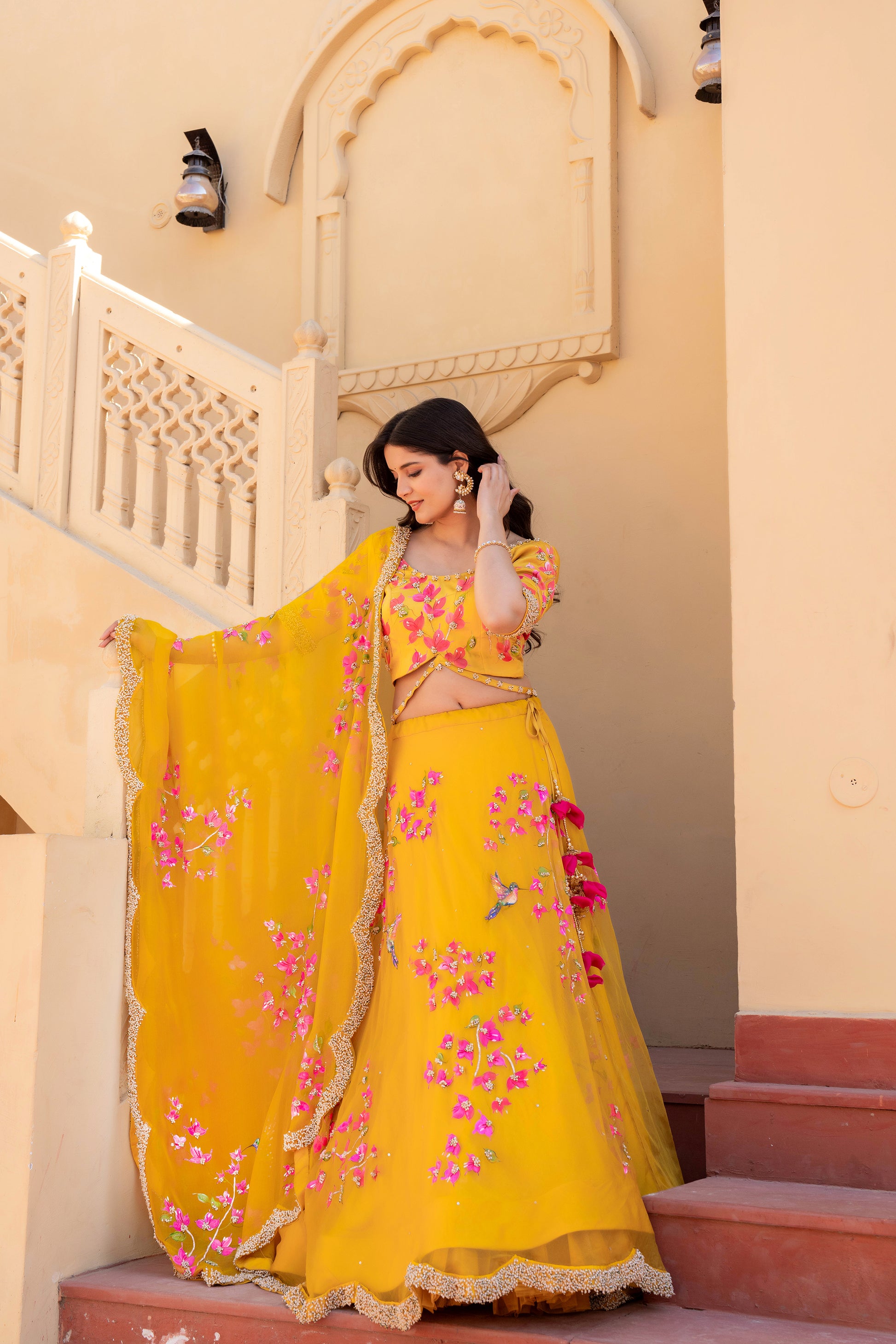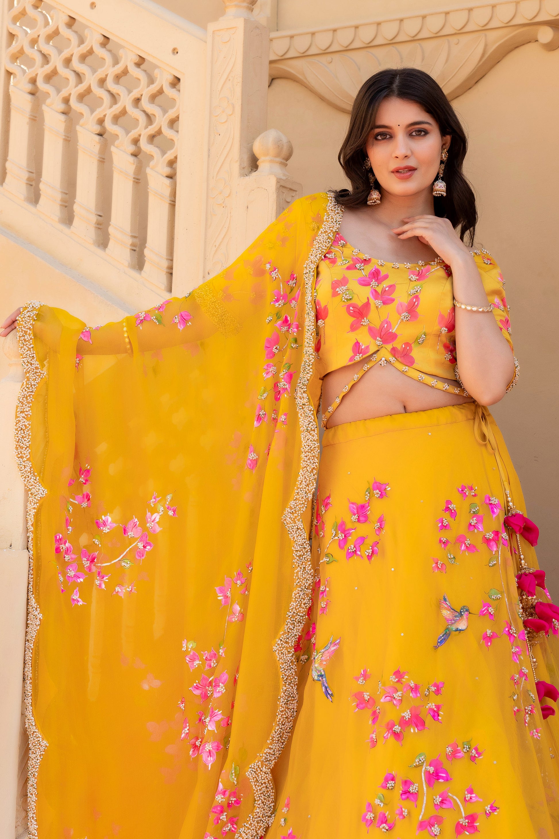Celebrate timeless artistry with our Hand-Painted Bougainvillea Organza Lehenga, drenched in a rich deep mustard yellow hue. The lehenga features vivid, hand-painted bougainvillea floral motifs, delicately brushed by skilled artisans to reflect the essence of blooming elegance.