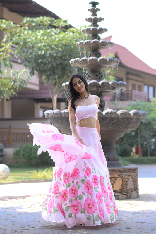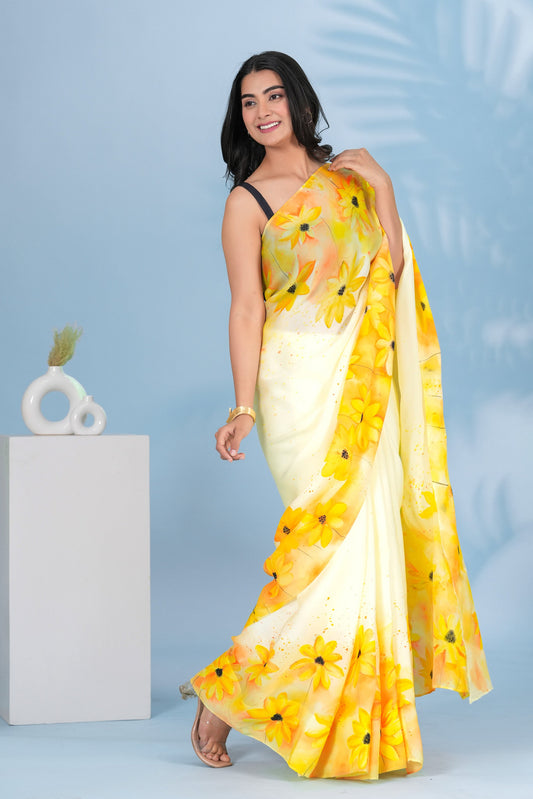 HAND PAINTED SWAMP FLOWER SATIN ORGANZA SAREE